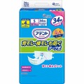 3.体を横にし、おむつを図のように置きます。水色の「横モレ防止ギャザー」をしっかり立てて、左右のギャザーの間にパッドがきちんと入っていることを確認してください。