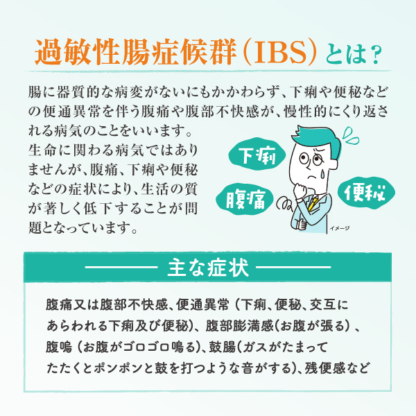 ●IBSは、腹痛又は腹部不快感とそれに関連する便通異常 ( 下痢及び便秘 ) が繰り返し又は交互にあらわれる病気で、ストレスの多い先進国において多く認められています。