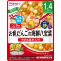 野菜(にんじん(国産)、とうもろこし、たまねぎ、だいこん、キャベツ、さやいんげん)、白身魚ボール(たらすり身、たまねぎ、でん粉、パン粉(小麦を含む)、粉末状大豆たん白、植物油脂、食塩)、じゃがいも、しょうゆ、砂糖、ほたてエキス、チキンエキス、ごま油、食塩、米酢、乾燥わかめ/増粘剤(加工でん粉)、炭酸カルシウム、クエン酸、ピロリン酸鉄