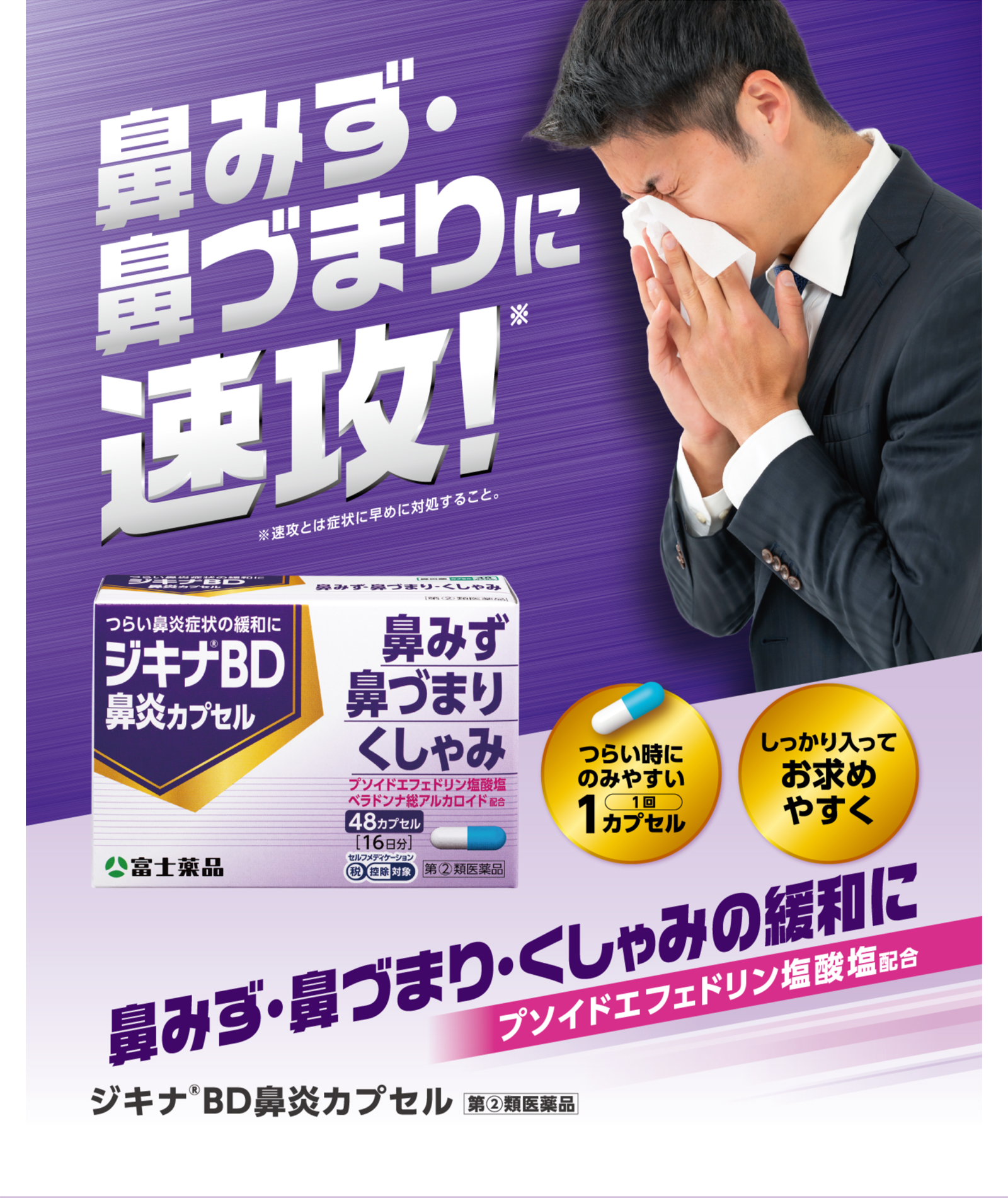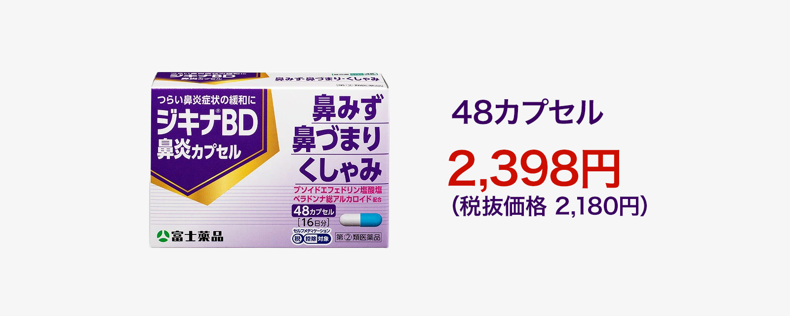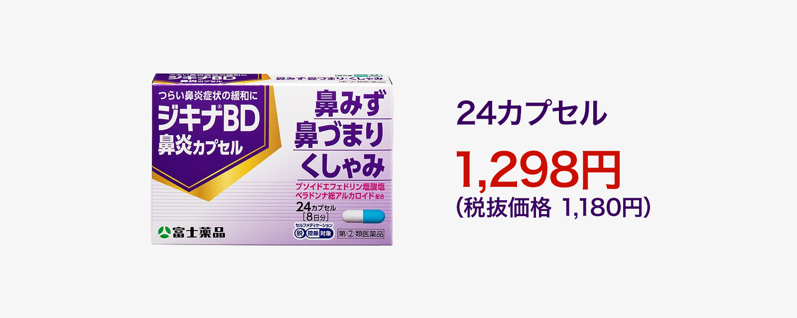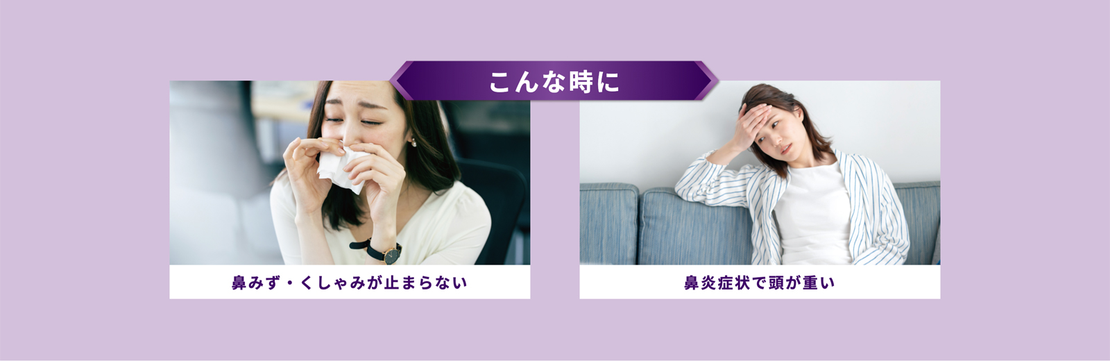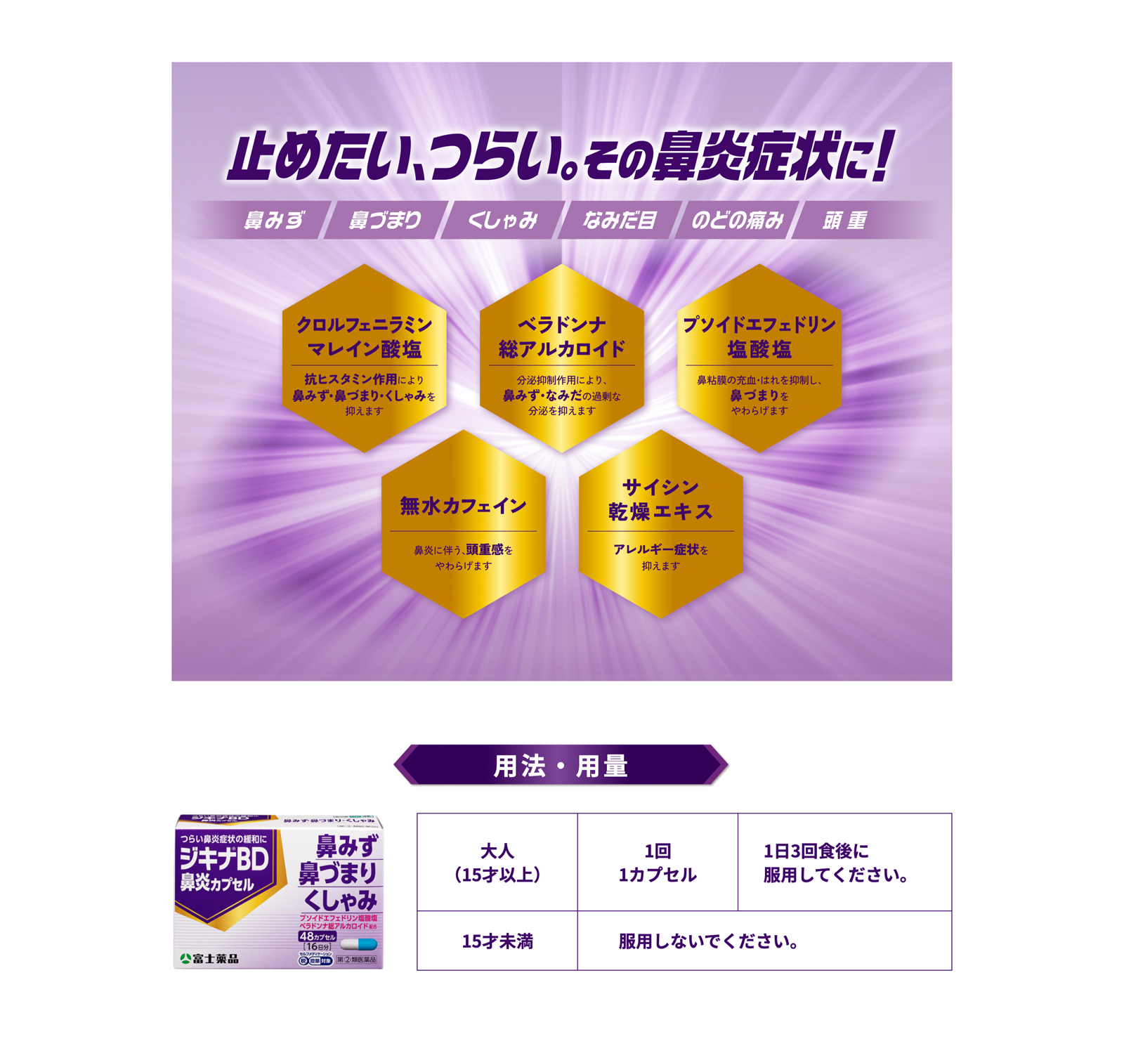 【効果・効能】急性鼻炎、アレルギー性鼻炎又は副鼻腔炎による次の諸症状の緩和:くしゃみ、鼻みず、鼻づまり、なみだ目、のどの痛み、頭重